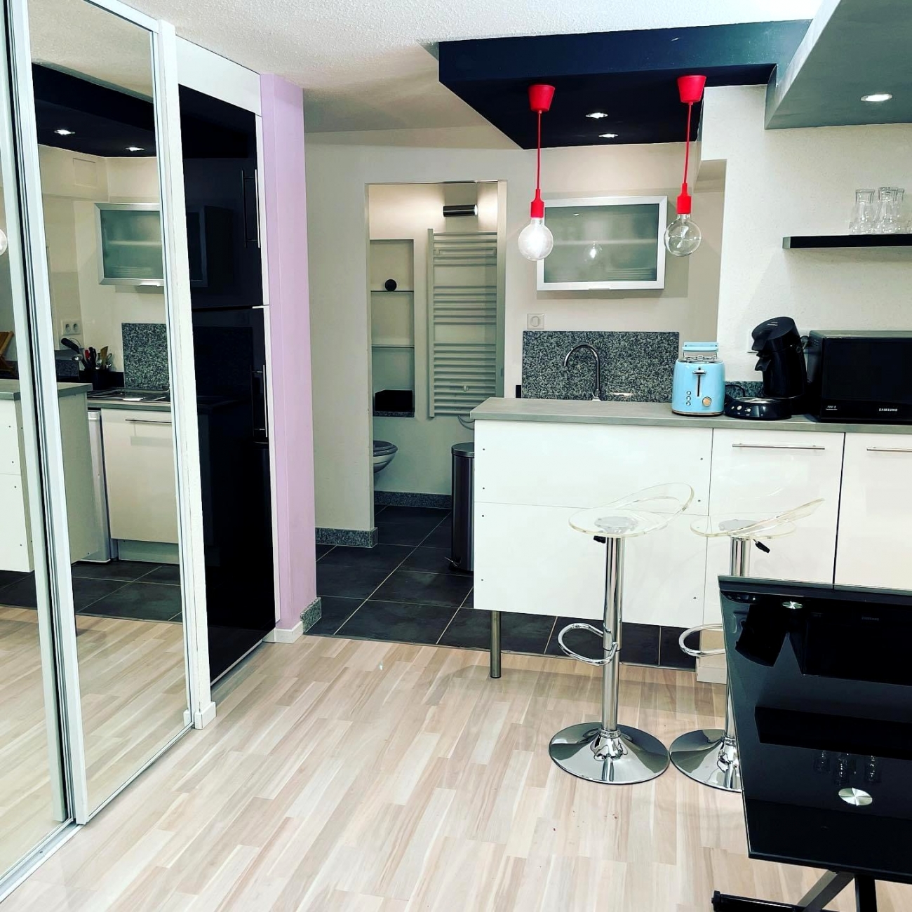 Une entrée sur vaste pièce à vivre meublée avec rangements (banquette KZ, bureau, TV…) ouverte sur un espace cuisine meublé & équipé (micro-ondes/plaques gaz/top…), une salle d\'eau (douche, machine à laver, rangements) & WC suspendus.