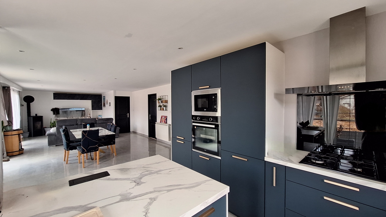 Une vaste & lumineuse pièce à vivre avec cuisine "moderne" ouverte meublée & équipée (ilot centrale, plaques de cuisson gaz/four/micro/hotte/lave-vaisselle/réfrigérateur) donnant accès à l'extérieur, trois chambres, une salle d’eau, un WC séparé & suspendu avec lave-mains.